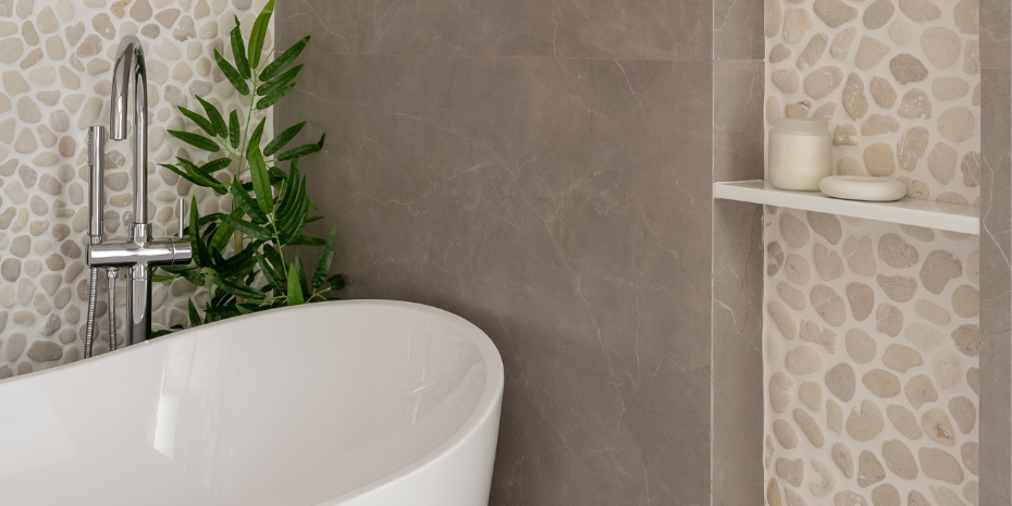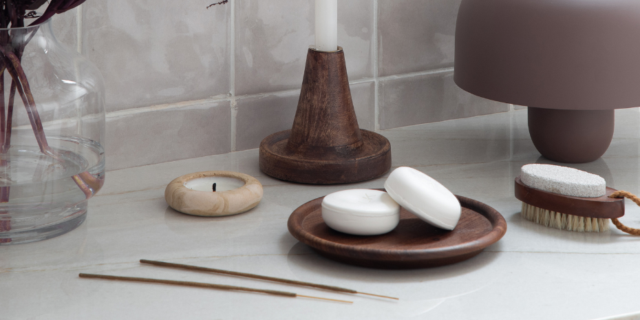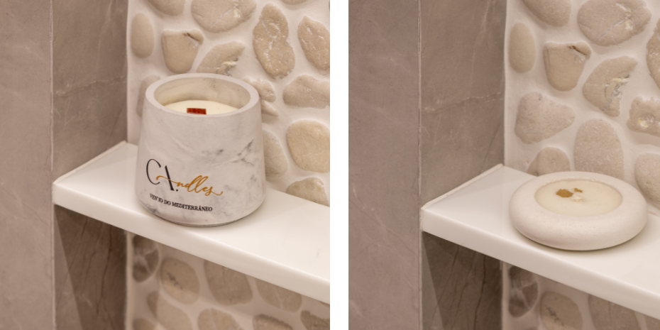 _Neste banheiro-refúgio dos sonhos as velas da Coleção ORIGEM se integram como extensão natural do ambiente em meio às pedras e texturas dos acabamentos. Um espaço de pausa que acolhe o corpo e aquieta a alma.