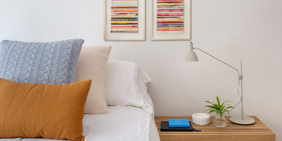 _O seu pote artesanal com acabamento e textura que lembra pedra esculpida pelo tempo, se integra ao quarto em diálogo perfeito com esse projeto contemporâneo.
