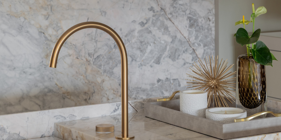 _O par de velas da Coleção ORIGEM encontra lugar perfeito nesse cenário de tirar o folêgo em meio ao mármore, o dourado e elementos naturais que desenham uma atmosfera de sofisticação.